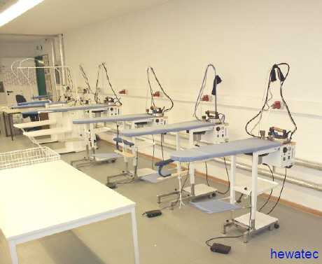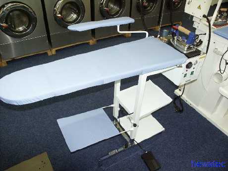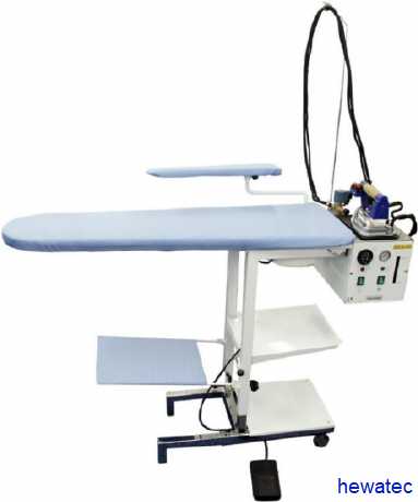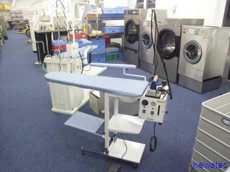 Dieser kleingewerbliche Bügeltisch hat einen Edelstahlkessel mit zirka 4,5 Liter Wasserinhalt und ermöglicht damit je nach Dampfabnahme den Einsatz über mehrere Stunden ohne Unterbrechung.